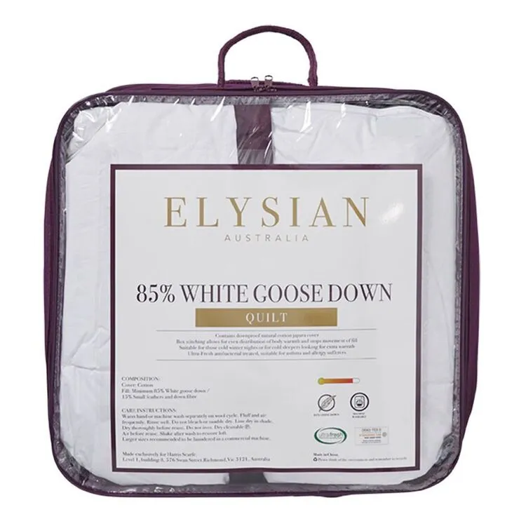 The Elysian 85/15 White Goose Down & Feather Quilt contains a minimum of 85% White Goose Down encased in a 290 thread count down proof natural cotton japara cover for the ultimate in sleeping luxury. It features elegant box stitching and satin piped sides allows for even distribution of body warmth, while the ultra fresh antibacterial treatment on the fabric makes it suitable for asthma and allergy sufferers. This quilt is suitable for cold winter nights or for cold sleepers looking for extra warmth.