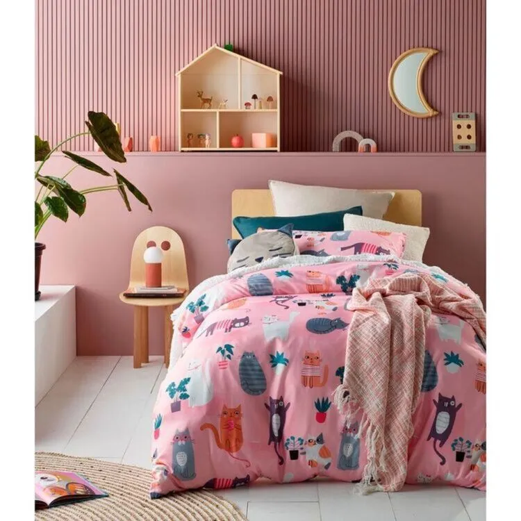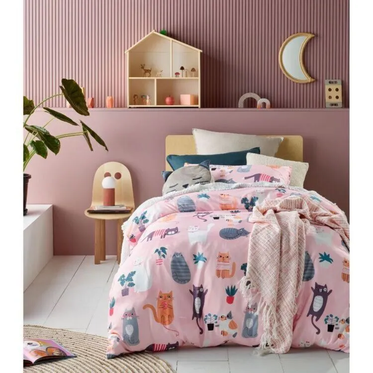 The Happy Kids Miaow Glow In The Dark Quilt Cover Set is perfect for kids who love their feline friends. This pink quilt cover set features a variety of adorable different coloured cats in various poses to keep your child amused. With an added special glow-in-the-dark feature, your kids are sure to love lazing around at night in bed!