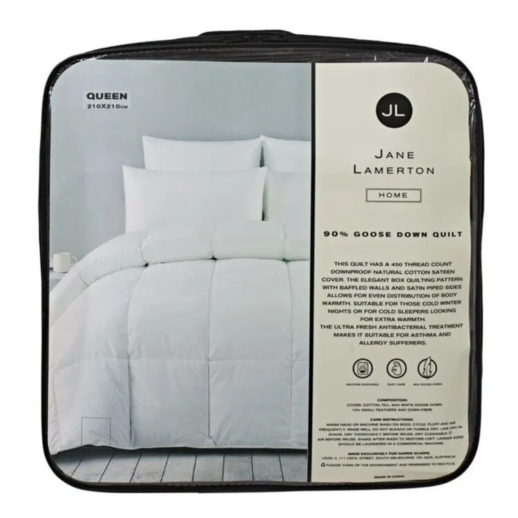 Featuring a 450 thread count down-proof natural cotton sateen cover and ultra-comfy fill, the Jane Lamerton 90/10 Goose Down Quilt provides decadent comfort all year round. The elegant box quilting pattern with baffled walls and satin piped sides allows for even distribution of body warmth, suitable for those cold winter nights or for cold sleepers looking for extra warmth. The Ultra Fresh antibacterial treatment makes it suitable for asthma and allergy sufferers.