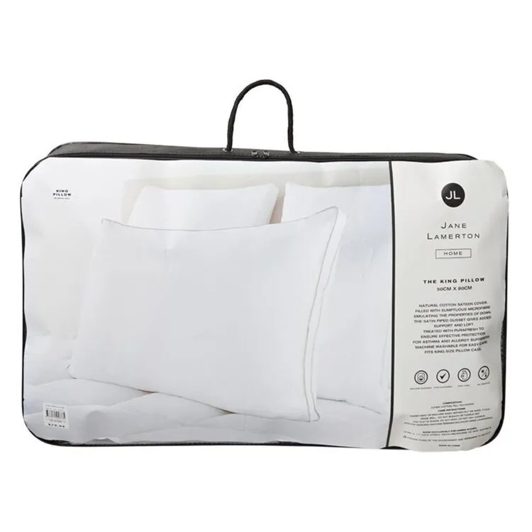 This Jane Lamerton Down Alternative Pillow King is filled with a plush microfibre material, emulating the soft comfort of down. The satin piped gusset gives added support and loft, and a premium Ultra-Fresh treatment ensures effective protection for asthma and allergy sufferers. Machine washable for easy care. Fits standard European size pillowcase.