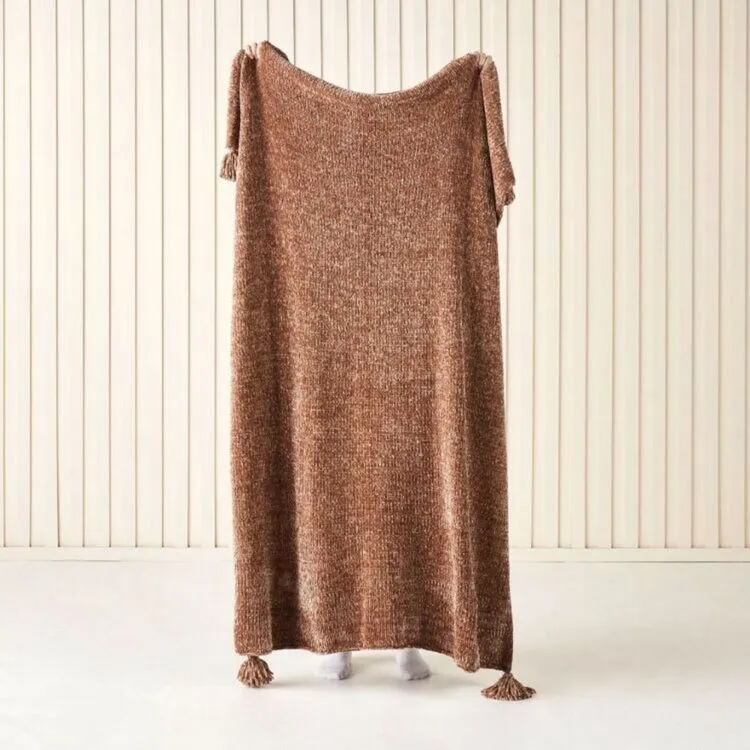 This textured throw in brandy will effortlessly work in your bedroom or living area and is trimmed with pom-pom corners for a distinctively playful accent.