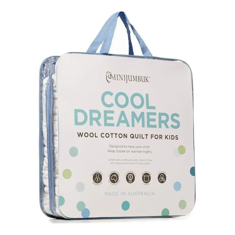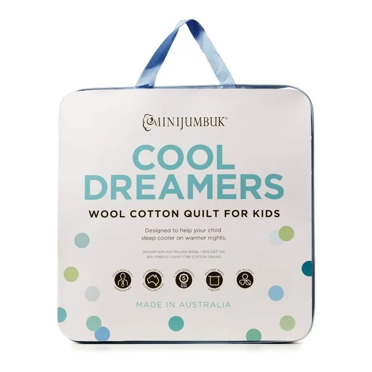 The MiniJumbuk Cool Dreamers Kids Wool Quilt is designed to help your child sleep cooler on warmer nights. Balancing 50% Wool and 50% Cotton fill, this 200 GSM quilt will give your child the comfortable deep rest they need over the warmer seasons. Shop the MiniJumbuk range at Harris Scarfe in-stores and online today!