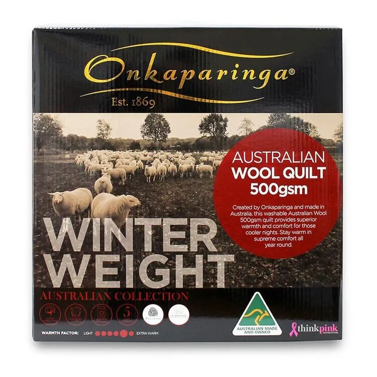This luxurious Onkaparinga 500Gsm Australian Made Wool Quilt King Bed is made using washable Australian wool filling and provides the ultimate in warmth and superior comfort for year round use. Made in Australia from the finest materials this quilt is made for those who demand the best.