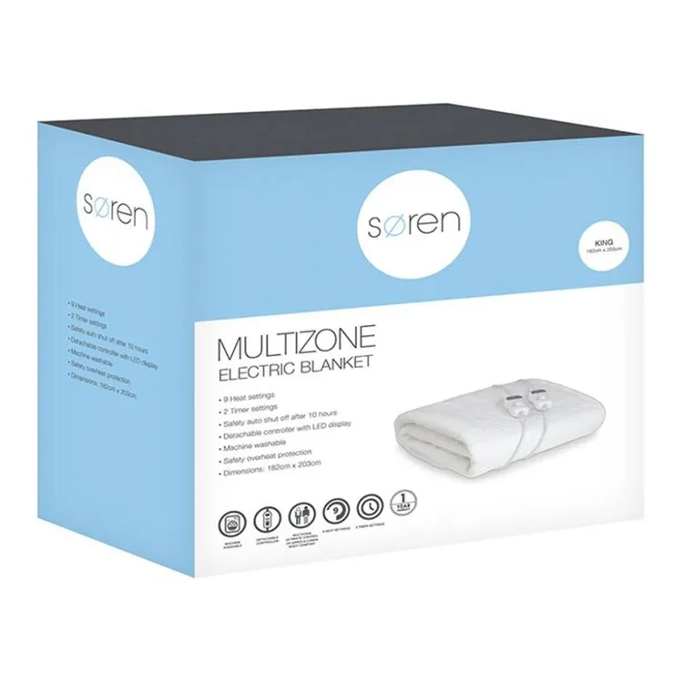 Snuggle up this winter with the Soren Multizone Electric Fitted Blanket King Bed, and let its 9 heat settings and multizone design chase away the evening chill! This Fitted Electric Blanket features a range of timers and a 10 hour auto-off setting, ensuring you stay warm and cosy all through the night. Overheat and over current protection will let you relax with peace of mind.