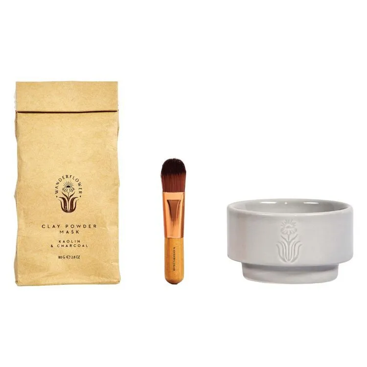 The Wanderflower Clay Face Mask Kit will give your skin a beautiful, natural glow. This nature-inspired kit, containing kaolin and charcoal Clay Powder, is complete with a bespoke Ceramic Bowl and a Brush Applicator. Whether you’re treating yourself to a pamper on a sleepy Sunday morning, or you want your skin to have that extra glow before a day out, simply open up your Clay Face Mask Kit. Mix the powder with water in the ceramic bowl and smooth the mask over your face, inhaling the earthy scent as it dries. Soon, your face will glow: cleansed, purified, and cared for. The carefully considered formula contains no parabens, is vegan friendly and cruelty free for your peace of mind.